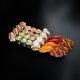 6 hosomaki salmón, 6 hosomaki aguacate, 4 uramaki california salmón, 4 nigiri salmón